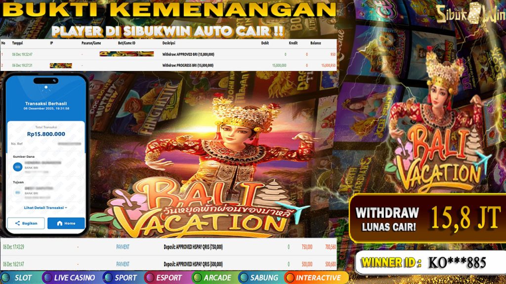 BUKTI KEMENANGAN 06 DESEMBER 2025 DI GAME Bali Vacation 15,8 JUTA