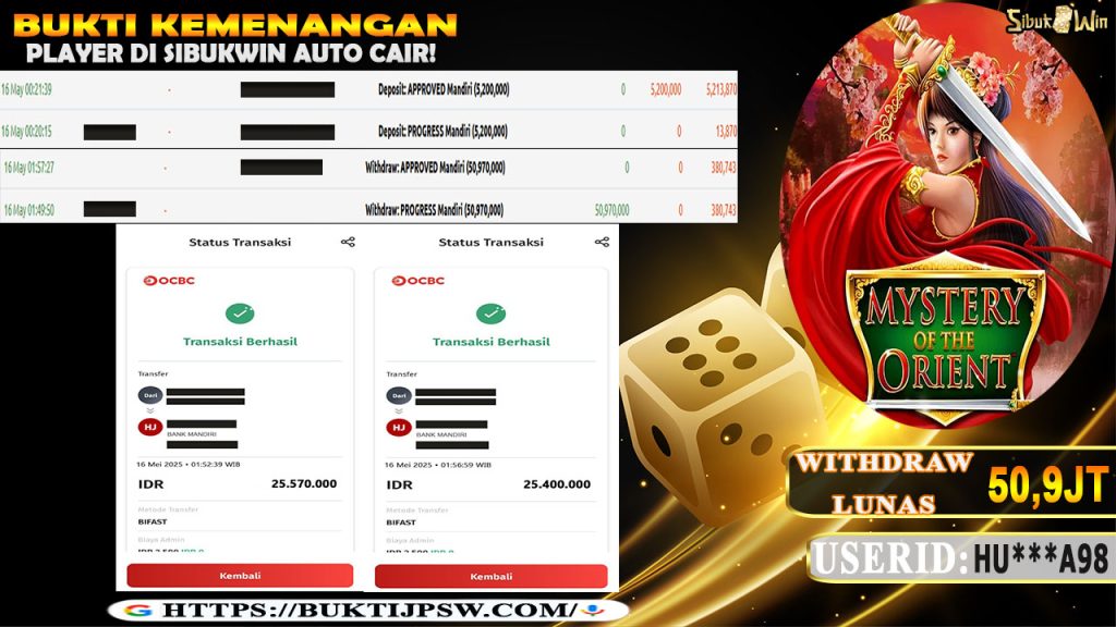 Bukti Kemenangan 16 MEI 2025 Di GAME Mystery Of The Orient WD 50,9 Juta