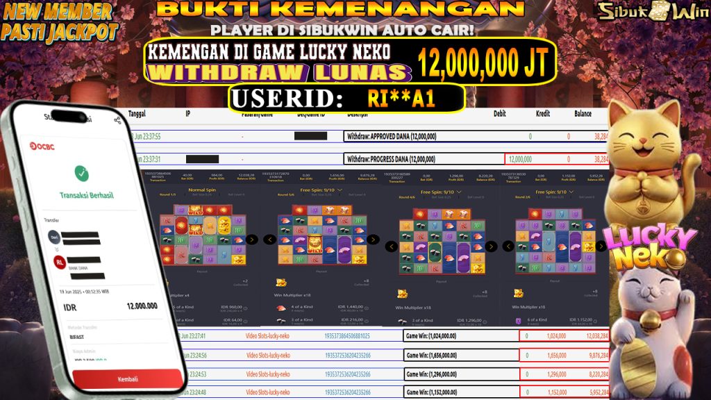Bukti Kemenangan 19 JUNI 2025 DI GAME Lucky neko WD 12 Juta