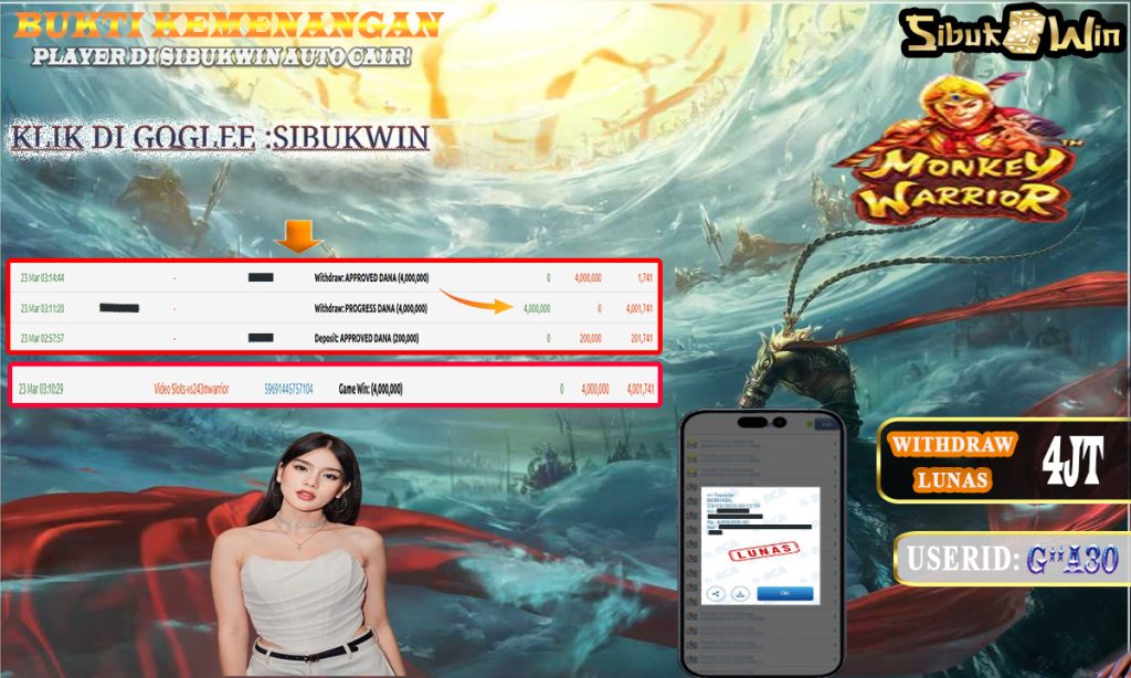 Bukti Kemenangan 23 Maret 2025 Di Game Monkey Warrior WD 4 Juta