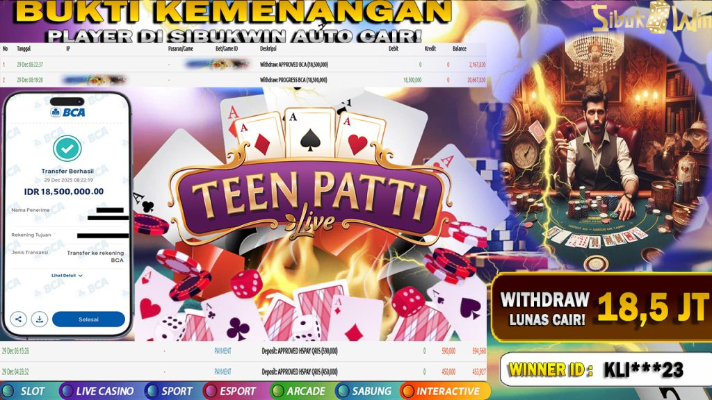 Bukti Kemenangan 29 Desember 2025 Di GAME Teen Patti 18,5 JUTA