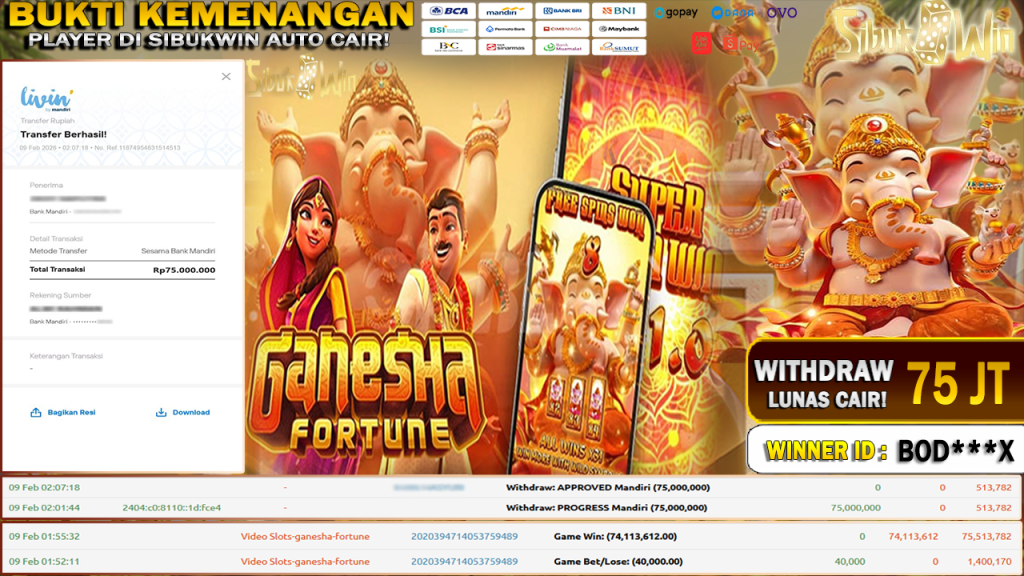 BUKTI KEMENANGAN 9 FEBRUARY DI GAME GANESHA FORTUNE WITHDRAW RP 75.000.000.-